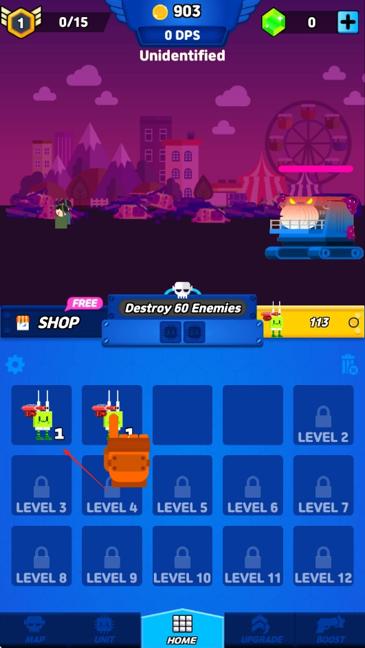 2、合成后的电子产品,将其拖动到场景内,让电子产品攻击怪物,获得金币,获得的金币可以购买低级的电子产品。