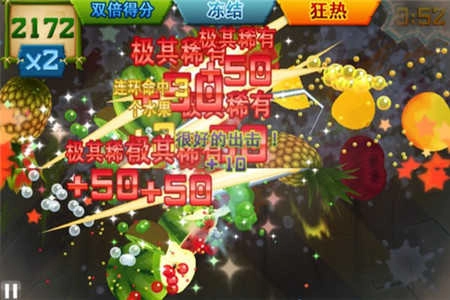 Zen:图标为苹果的Zen模式中,没有炸弹,只会不断出现水果,时间为1分半。在这一分半内谁因连击而切出的分数越高,谁就是胜利者。游戏不会因水果的掉落而失败。