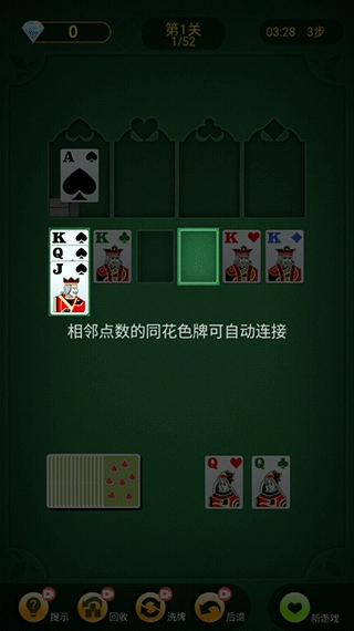 你得凭借自己的智慧牌局,最上方有四个格子分别对应纸牌的四种花色,游戏的核心目标是用最少的移动步数,将牌面上的十六组牌每次以三张为单位向右推动,按照纸牌从A到K的顺序完整排列。只要花色与顺序都准确无误,最上方的纸牌就会依据顺序吸附同花色的纸牌向上移动,一旦把所有纸牌都按花色收集完毕,就能赢得游戏胜利。因此,每一次向右滑动纸牌的机会都十分珍贵,要合理运用智慧去达成目标。