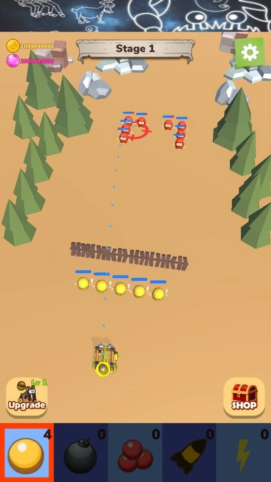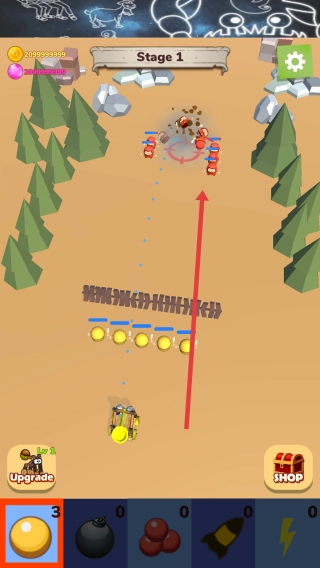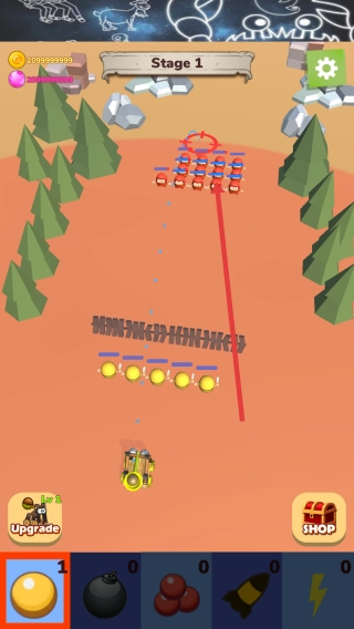 1、进入游戏的Stage1关卡后,点击底部的黄色炮弹图标,向红色敌人方阵发起基础攻击,攻击时优先选择集中的目标进行打击。