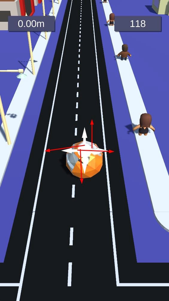 1、控制橙色球体在城市道路上滚动,球体能够朝前后左右四个方向移动,要留意避开道路上的行人。
