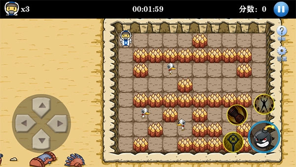 左侧是控制角色移动的虚拟摇杆,右侧是炸弹按键,另外的则是玩家在游戏挑战过程中收集到的相关道具。
