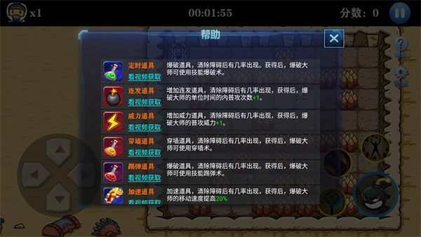 2、熟悉的操作,在你想要进行爆破的地方放下炸弹,并及时走开;爆破关卡内的木桩或其他建筑,可以随时获得一些道具,想要成功通关,不仅要消灭关卡内的敌人,还要爆破建筑寻找通往下一关的入口。