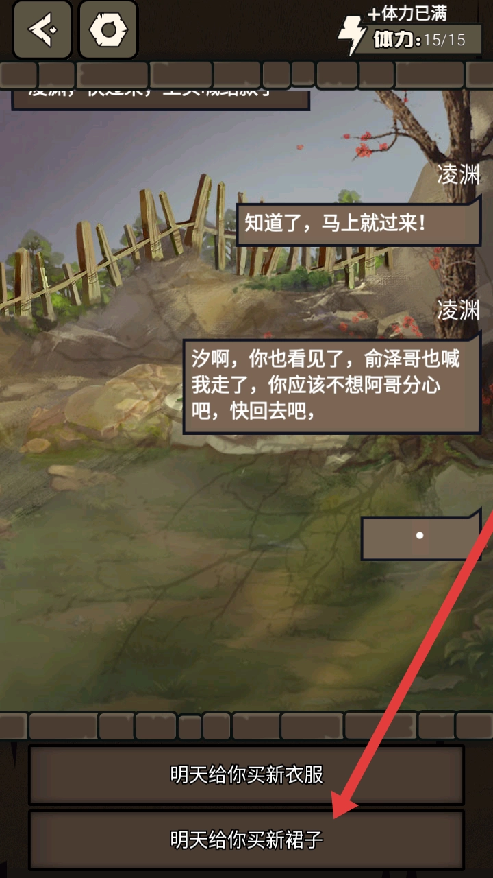 2、在与剧情人物对话选择时,需要根据之前的对话进行选择,这里选择明天给你买新裙子,回应角色的诉求。