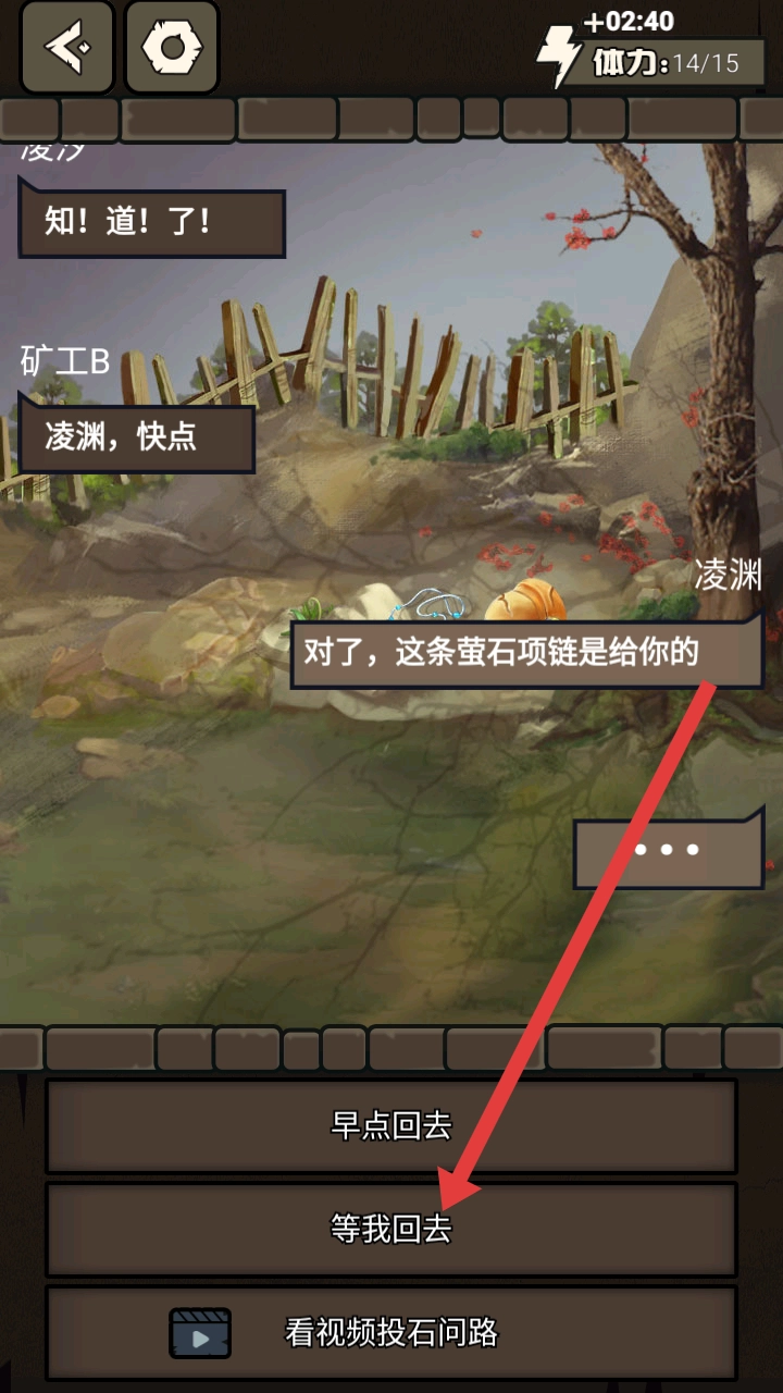 3、在接下来的剧情对话中,依旧还是根据之前的对话来进行选择,这里选择等我回去,回复对方的话语。