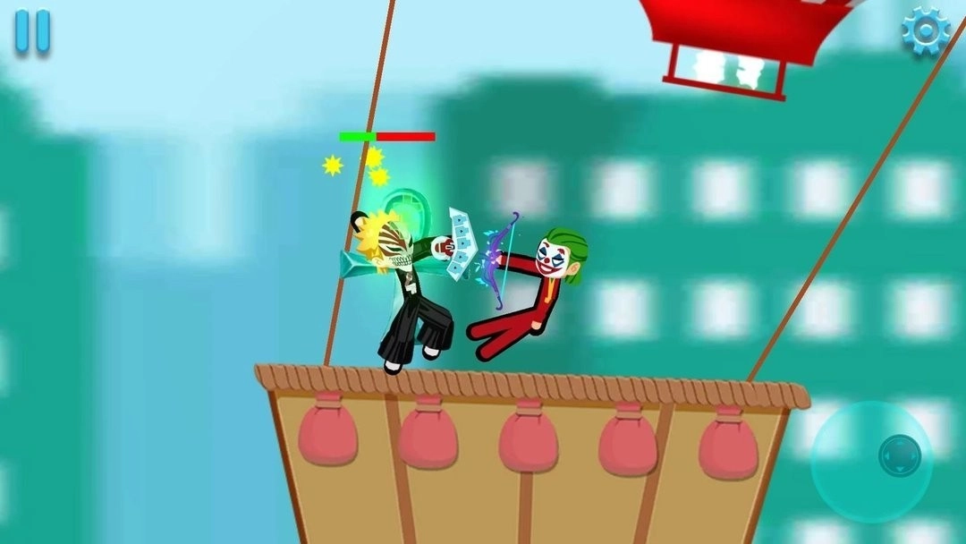 2、进入对战模式,在不同战斗场景中与其他火柴人展开对抗,利用跳跃、闪避躲避攻击,释放技能组合连招打击对手,削减其生命值。