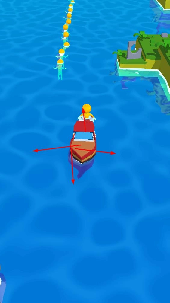 1、控制红色小船在蓝色水域里移动,船上有个黄色小人,要引导小船在水域中航行,收集其他黄色小人。