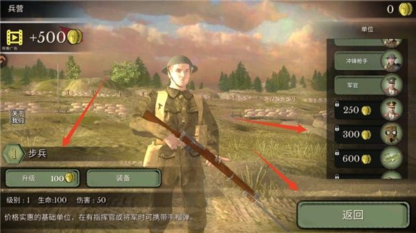 6、玩家可以在兵营进行兵种升级,以及解锁更多的兵种,解锁用的金币可以通过战斗获取。