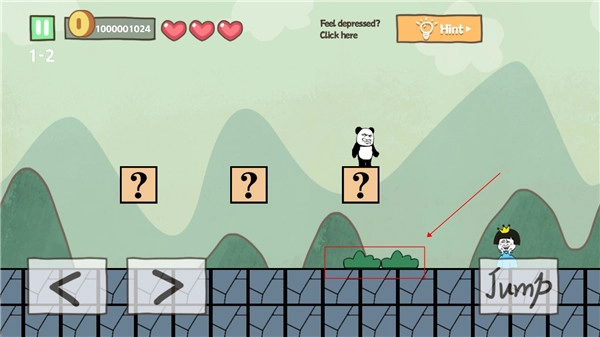2、撞击问号方块可以获得金币,前两个没事,第三个下方会出现陷阱,可以直接跳跃到方块上过去。