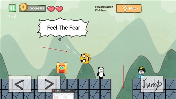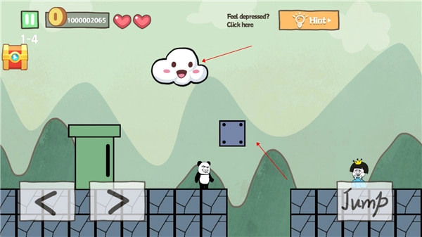 4、这一关不用理会前面的钥匙,直接往前走就好。这里和第一关有些相似,也存在一个隐形方块,把它引出来就行。注意别从云上跳下去,云其实也是个陷阱。