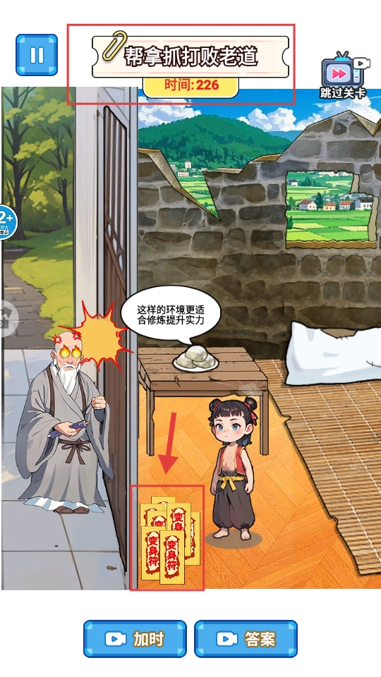 2、使用【变真符】后拿抓变身为成年形态,获得更强战力,可对抗门口的老道。