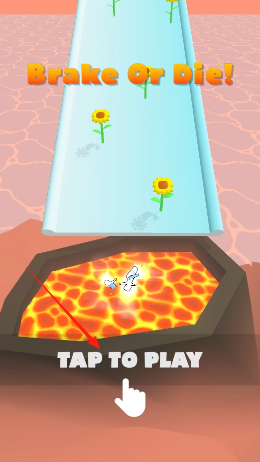 1、点击“TAP TO PLAY”即可开始游戏,角色会在跑道上滑行,你需要在合适的时机刹车来避开熔岩,开启这场紧张刺激的跑酷挑战,同时体验开局的启动机制。