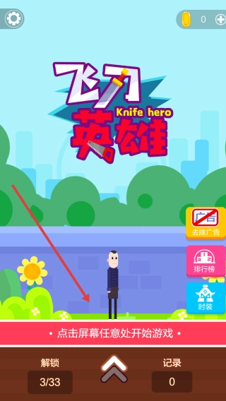 1、启动游戏后,点击屏幕上的任意位置,即可直接进入游戏挑战环节,开启操控英雄投掷飞刀的冒险之旅。