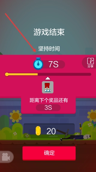 3、游戏结束界面显示坚持时长如7S,与奖励20金币,点击确定结算,可重开挑战刷更高生存时间。