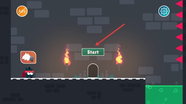 1、角色位于初始场景中,两侧的火炬照亮着绿色的Start标识,点击这个标识,就可以进入关卡选择界面,开启冒险之旅。