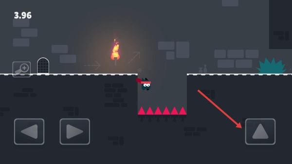 3、行进时遇悬崖尖刺陷阱,瞅准时机点击右侧跳跃按钮,操控角色跃过尖刺,持续推进关卡进程。