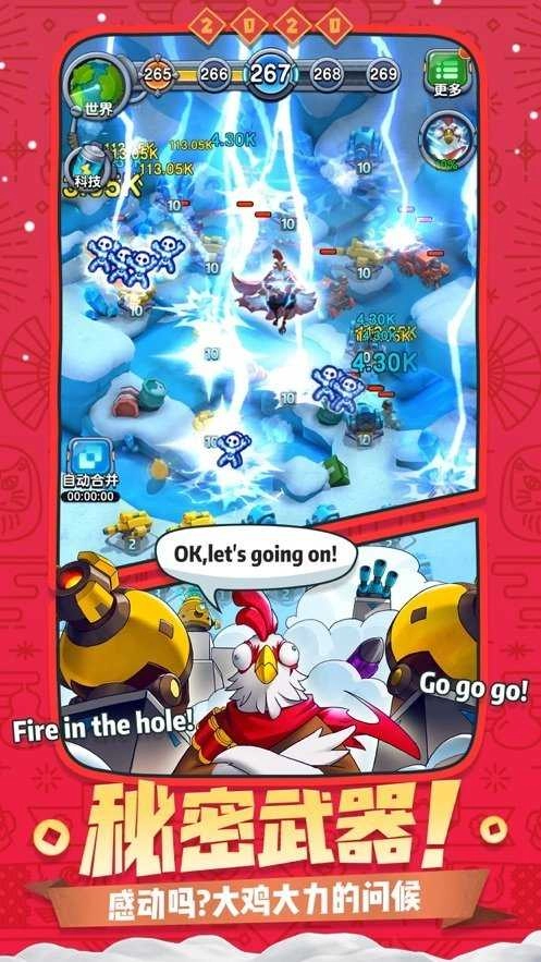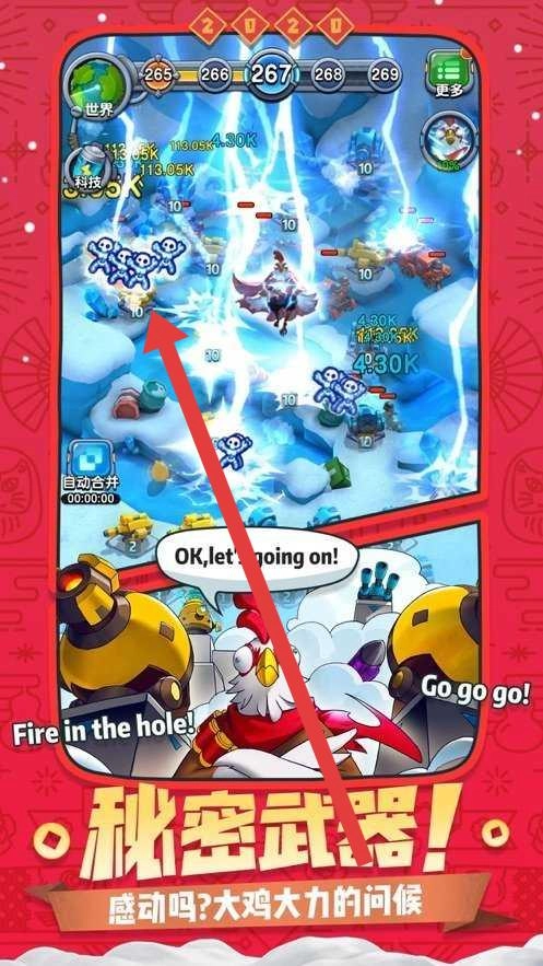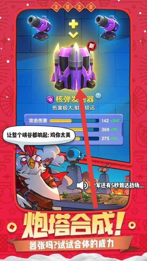 2、战斗界面,布置炮塔,利用“秘密武器”(如大鸡助力),攻击箭头指向的敌人,守护阵地。