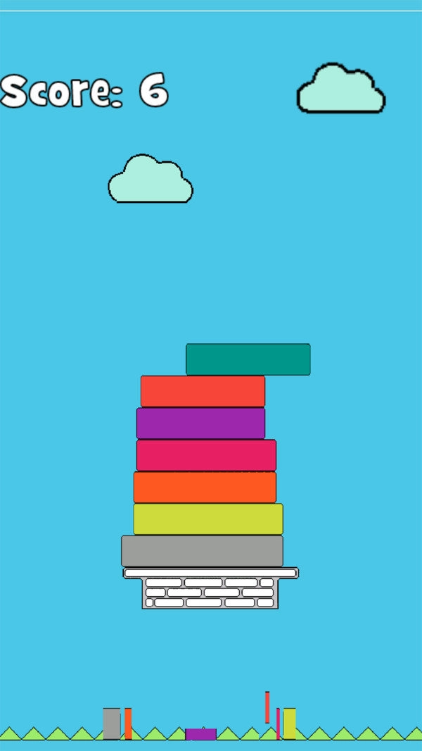 1、点击堆叠积木高塔:核心玩法是通过点击屏幕控制五颜六色的积木堆叠,从地基开始一步步向上搭建,目标是让塔尽可能接近天空,堆得越高得分越高。