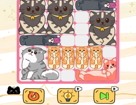 1、观察关卡给出的区域轮廓,尝试将猫咪方块放入合适位置,确保无空白区域。