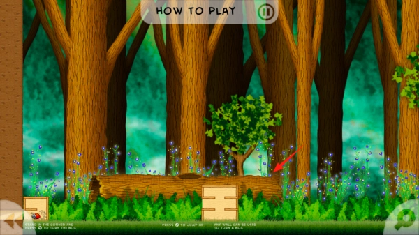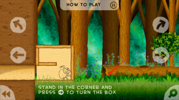 2、在“HOW TO PLAY”场景,操控小虫推动木箱,按提示“STAND IN THE CORNER AND PRESS → TO TURN THE BOX”,让小虫在角落转动木箱,体验玩法的教学环节。