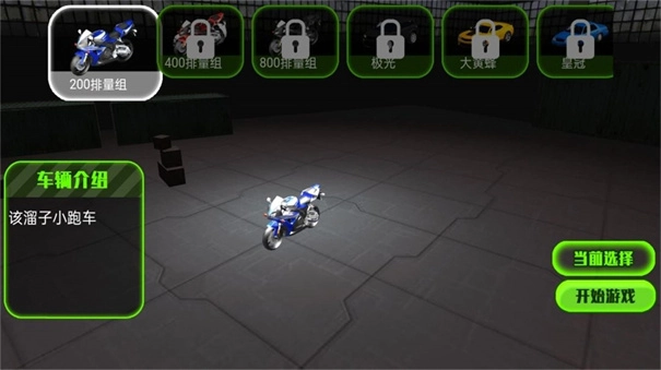 1、在车辆选择界面,挑选【200排量组】的蓝色摩托车,点击【开始游戏】按钮,即可进入熔岩赛道开启挑战。