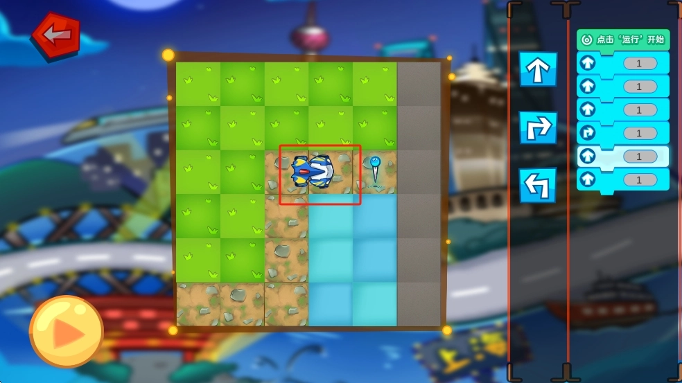 1、指令模块编程:在关卡中,通过拖拽屏幕下方的指令模块(如“向前走”“跳一下”“重复3次”),按逻辑顺序排列成“程序”,点击运行后,卡卡会按照指令行动。