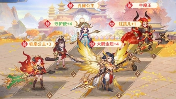 白骨夫人1号,所有人一起攻击,一套大范围的 AOE技能。2号位的黑无常输出+怒气降低,3号位的主角补伤害。白鼠4号位治疗回血;5号位:孟婆输出+怒气值+对下一位神将造成伤害。6号位阎君和孟婆同时上场,增加了自己的伤害,并有一定几率对后排造成持续伤害。