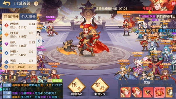 门派Boss是奖励种类最多的活动,千万不要错过。活动持续10分钟,每个人可以挑战Boss 3次,抢夺其他门派积分3次,最终积分总和(与参与人数、参与人战力相关)决定门派拍卖的奖励丰厚程度。