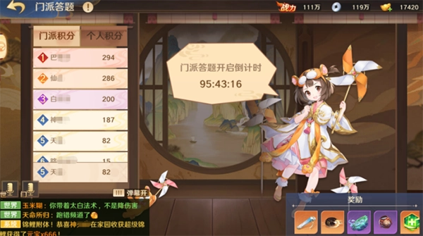 门派答题是类似知识问答的方式,每道题有4个答案选项,总共十道题,跟参与人数、每个人答对数相关,同样门派积分总和越高获得的奖励越高。
