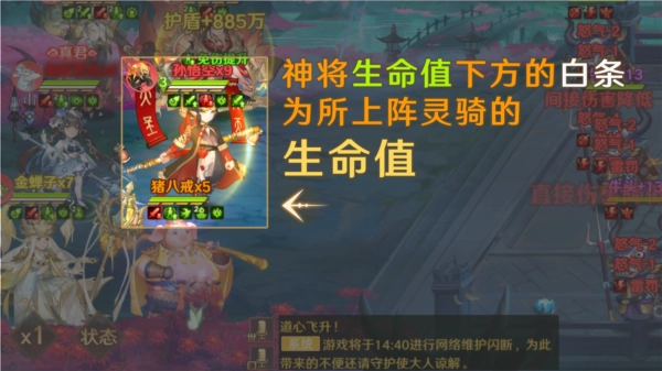 血条与灵骑等级资质和进阶有关,灵骑血量继承上阵它的神将血量,进阶越多继承比例越大,阵亡后大部分灵骑天赋技能不再生效,但其他技能则不是,这一点会在之后的技能篇攻略里分享。
