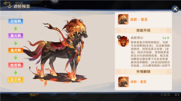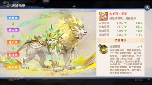第四位活动灵骑金毛犼,笔者强烈推荐各位守护使优先抽取(如果是鹿灵骑碎片在50以下建议先更换为狮子,等拥有白板狮子后再继续抽取鹿),其天赋技能分两条,后一条为简单粗暴的属性加成,满级加40%伤害与免伤(鱼的两倍……),15%技能增强与抵御(等于觉醒哪吒给队友的一半加成),同时有一条新的词条描述,可以将已有的属性增加类效果提高30%(近三分之一的提升),减少类降低30%,一句话,很离谱的数值提升,敌有我无,敌无我有完全是两个概念。
