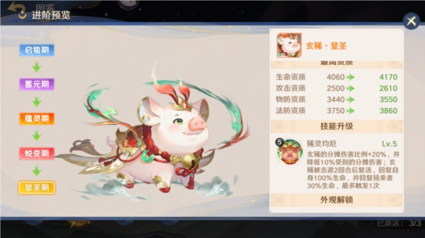 再说说云鲤(鱼)和玄豨(猪),鱼因为其光环属性,所以建议给第二养成度的神将,以防止过早阵亡,同理可由李贞英或二觉白骨携带,猪由阵容决定,一般给带有光环法术或增益词条却缺少一定自保能力的神将,比如谛听。