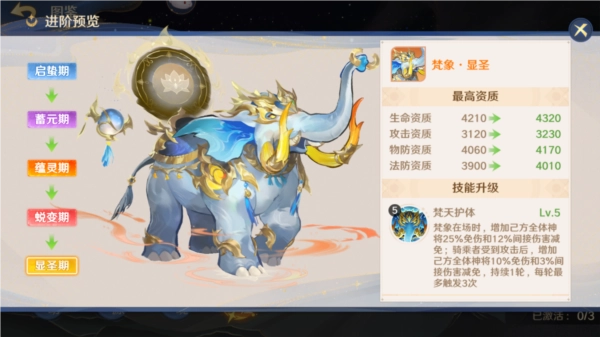 最后是笔者认为常驻灵骑中仅次于狐狸和鱼的象,其天赋技能有高贵的双免伤,同时挨打能叠加近乎翻倍,因此极其适合第二或是第三养成位的神将上阵,金将之外笔者推荐肉盾神将比如小白龙和青牛精,敖丙更佳,金将的话除去金猴皆可,核心思路是需在场且肉度高,嘲讽词条属于锦上添花可有可无,且目前个人不建议孔雀大明王上阵象,当然也欢迎开发对应思路前来讨论。