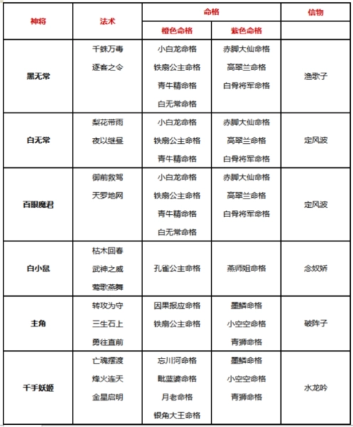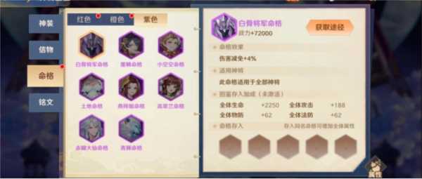 命格:前期就是有紫带紫,橙色命格要集中收集适合上阵神将的,以及考虑是否能跟法术做一些搭配,比如【阴魂不散】命格跟白骨夫人的法术就可以联动产生效果,命格搭配得好,才能发挥出神将最大的作用。