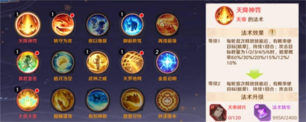 法术:每个神将有3个法术位置,分别在突破+0、突破+9、突破+13时解锁,那我们优先考虑每个神将初始只能带1个法术的情况,冥界必带的法术有:【梨花带雨】(增加己方女性神将10%免伤),其他的就是根据不同神将的特性来针对性地搭配法术。
