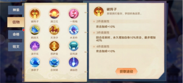 信物:最多可携带6套,要注意的是清平乐和菩萨蛮这两个有唯一特性的信物,意味着上阵神将中最多只需一人携带,带2套清平乐或者菩萨蛮的效果是不叠加的;渔歌子需要放在1号位才起作用,这些都是需要注意的。