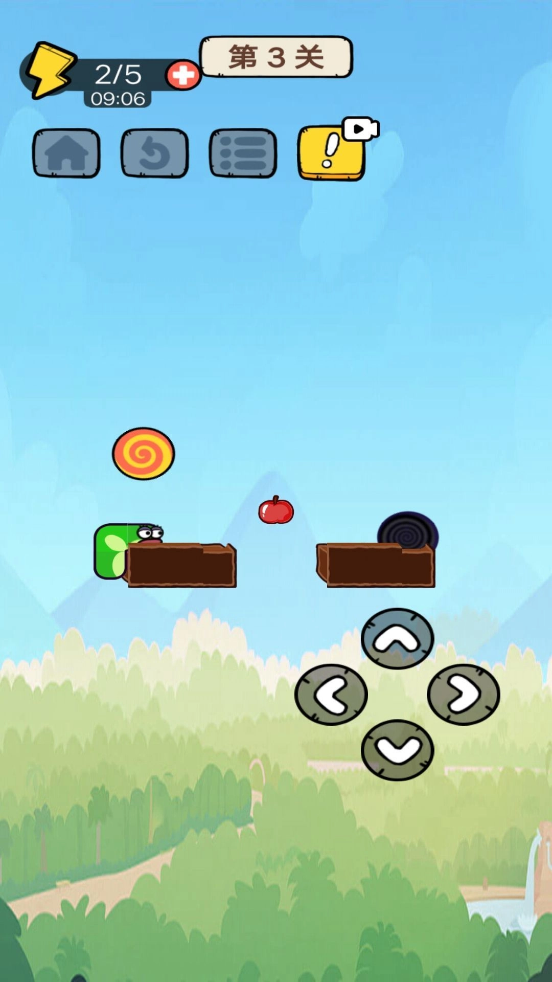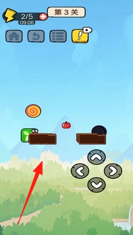 2、第3关用虚拟按键,控制绿色蛇形角色(箭头指向),躲避障碍(苹果、轮胎),收集糖果。