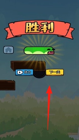 3、成功抵达终点后,点击“下一关”(箭头指向),进入新关卡,继续蛇形冒险。