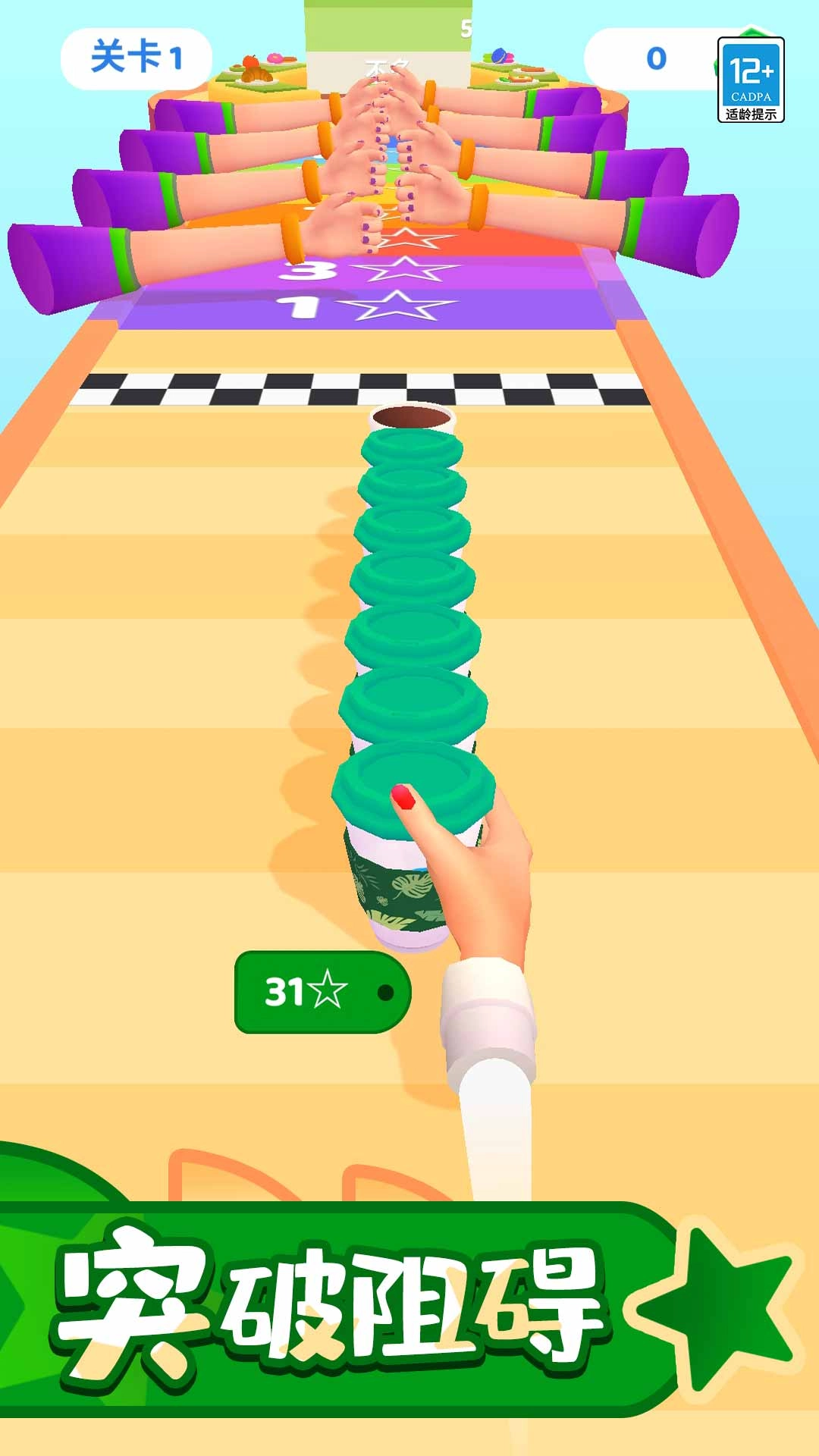 1、滑动屏幕操控手部移动,在赛道上接住杯子,途经配料区时糖浆、奶油等会自动添加,使奶茶口味更丰富多样。