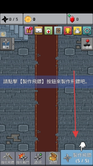 2、进入游戏后,根据提示点击右下角【製作飛鏢 (5 / 5)】按钮制作飞镖,积累飞镖数量,满足任务要求。