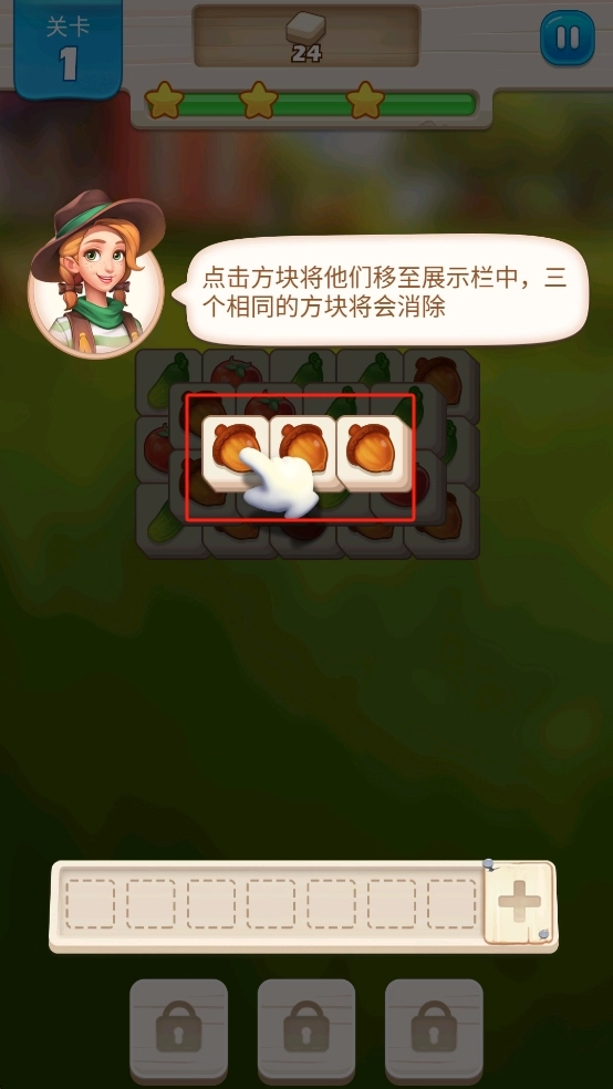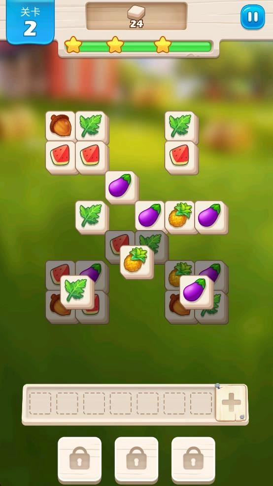 1、连线消除瓷砖:观察农场主题的瓷砖盘面,找出相邻的相同图案(如三块相连的胡萝卜),用手指划过进行连线,使其消除并完成关卡指定的消除数量目标。