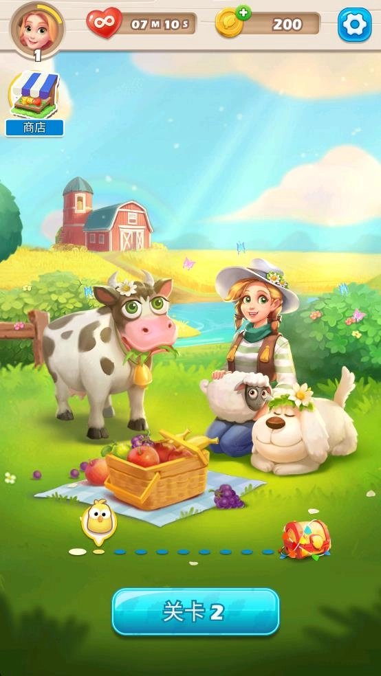 3、解锁全新内容:借助通关奖励开启新的农场场景瓷砖(像牧场、菜园、谷仓这类主题)以及消除特效(比如消除时会有花瓣飘落、音符音效相伴),让轻松的三消过程趣味更浓。