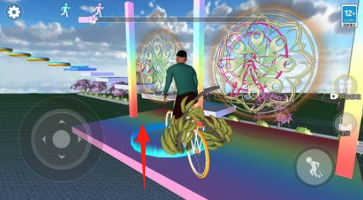 1、操控自行车,顺着箭头所指方向【骑行至彩色阶梯上】,注意维持平衡,防止香蕉掉落。