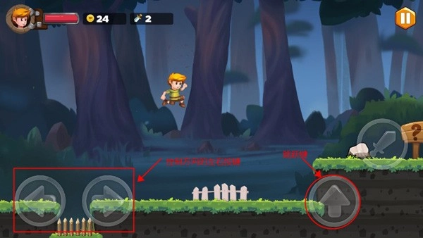 2、经典的操作方式,左下角控制左右方向,右下角跳跃领取金币。如果你拿到武器,发射按钮就会出现。