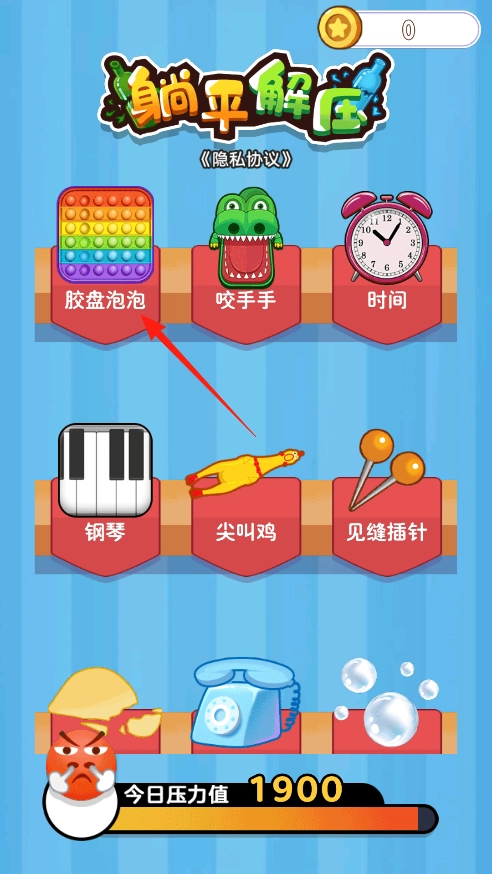 1、打开躺平解压游戏的主界面,找到并点击“胶盘泡泡”这一选项,进入该解压玩法页面。借助游戏的选择机制,开启彩虹泡泡盘的按压体验,通过点击操作来释放压力,感受视觉与触觉相融合的解压乐趣。