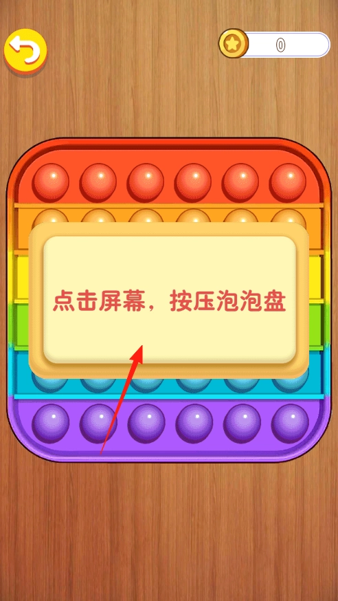 2、进入胶盘泡泡玩法,依据提示“点击屏幕,按压泡泡盘”,点击彩色泡泡,使其凹陷、回弹,借按压交互机制,模拟现实捏泡泡的解压感,重复操作,体验简单直接的放松玩法。