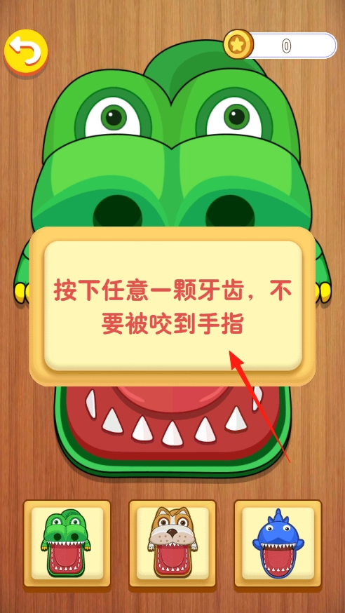 3、切换到“咬手手”玩法,按提示“按下任意一颗牙齿,不要被咬到手指”,点击鳄鱼牙齿,借随机触发机制,牙齿可能安全按下,也可能让鳄鱼咬手,体验刺激又解压的心跳挑战。