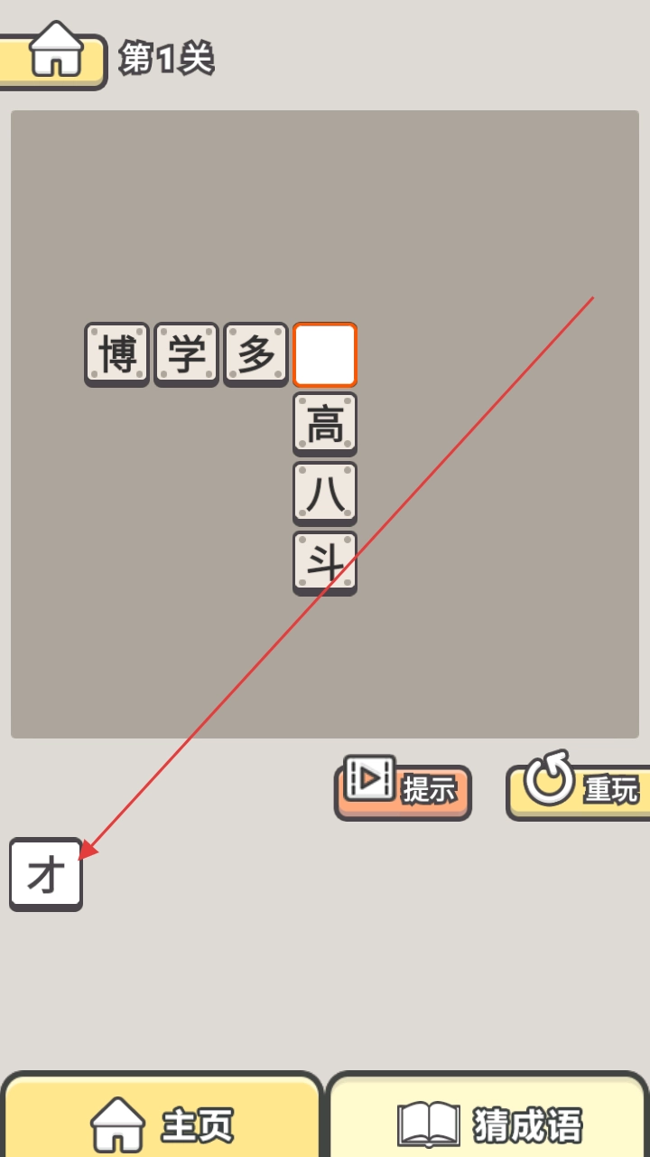 1、进入游戏后,选择关卡开启挑战。在每一关的游戏界面里,会展示由多个汉字方块构成的成语拼图,其中有部分方块是缺失的。