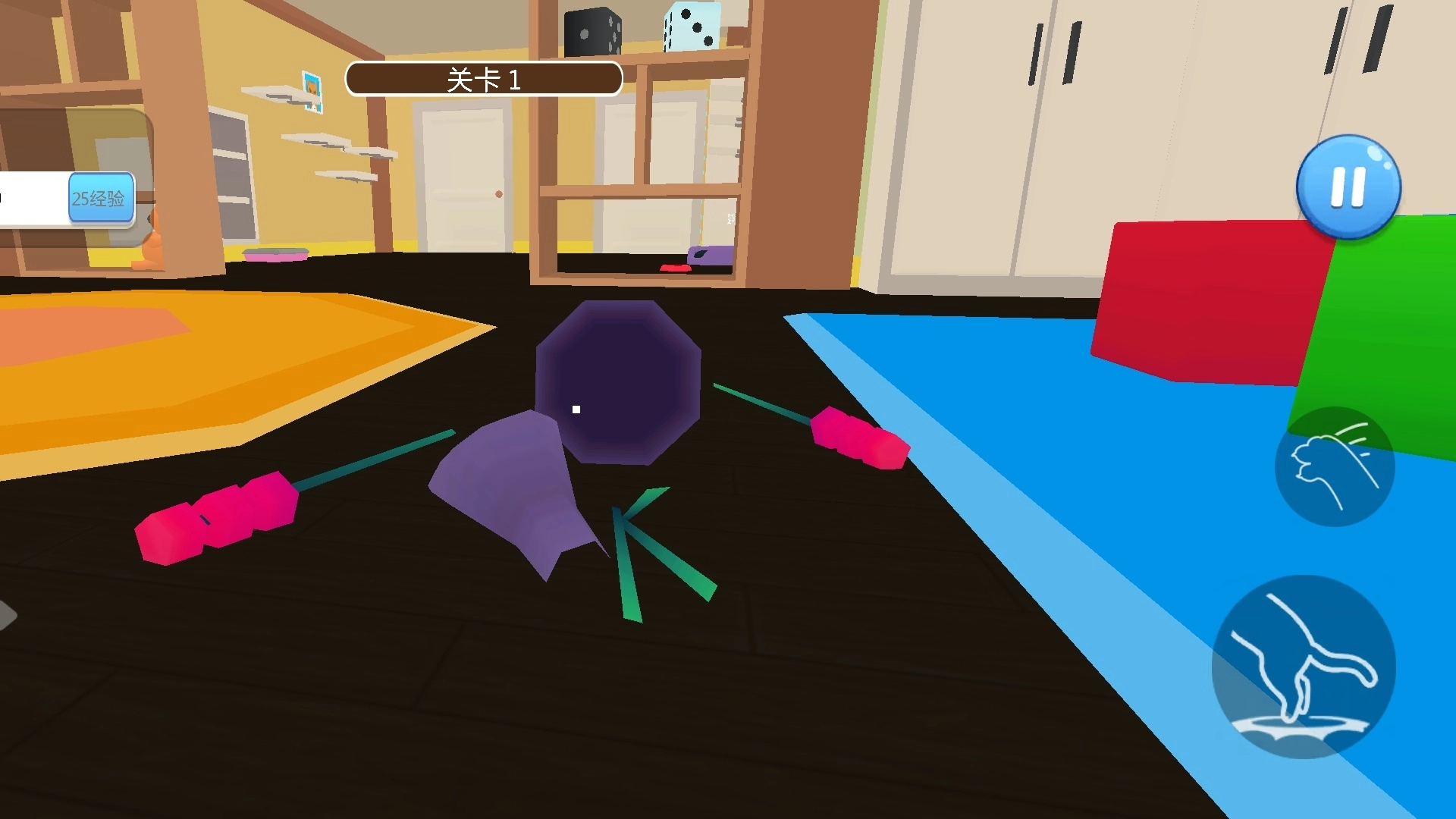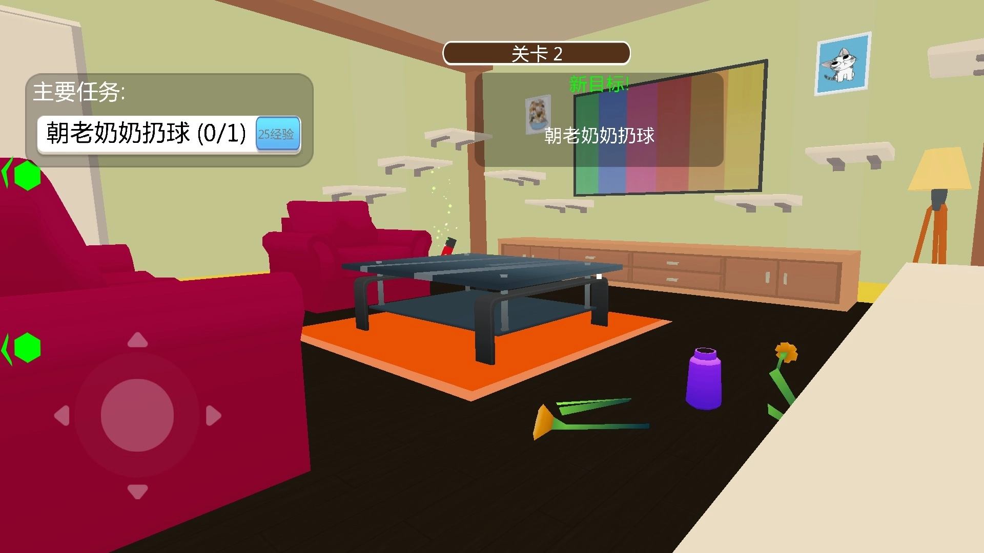 1、滑动虚拟摇杆操控猫咪移动,在客厅沙发与窗台之间穿梭,探索场景寻找任务道具,例如在角落发现需要丢弃的花瓶。
