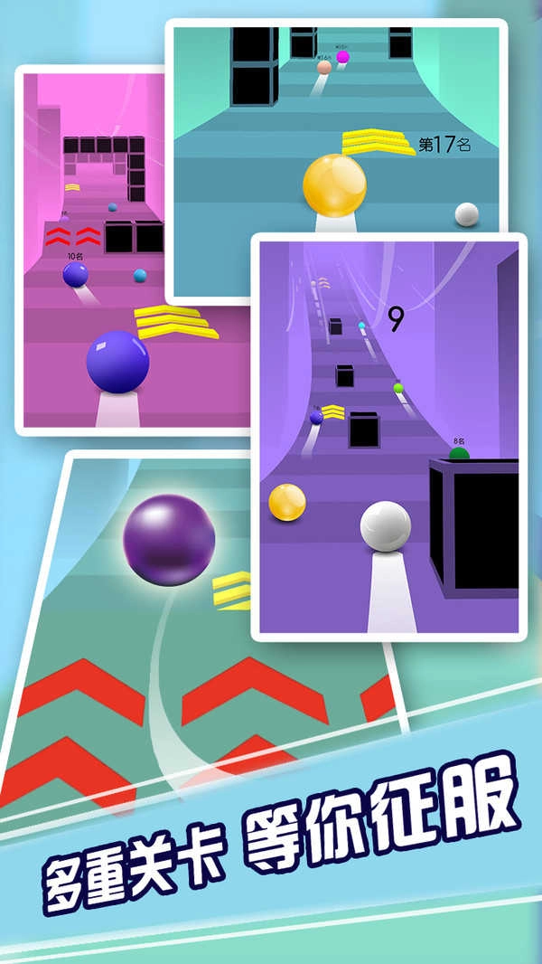 1、控制球球滚动:利用指尖力度和角度控制球球左右移动、调整速度,在赛道上不断前进,避开随机出现的障碍。